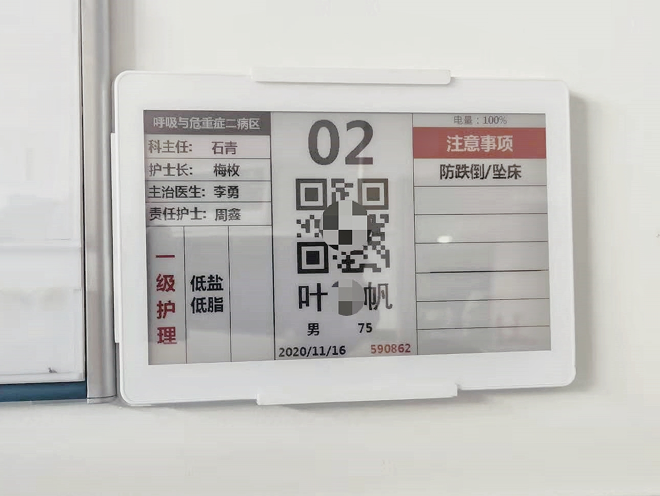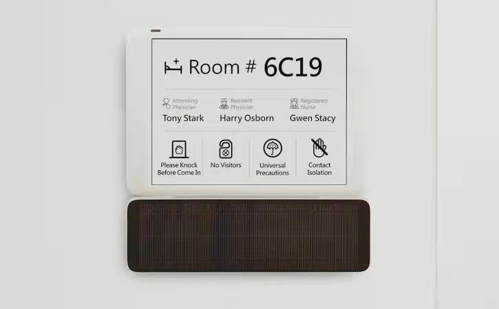 Das E-Paper-Display in Kombination mit der unendlichen Übertragungstechnologie ist mit dem Krankenhaussystem verbunden, um Informationen automatisch zu aktualisieren, ohne handschriftliche Aktualisierungen durch das Krankenhauspflegepersonal, was viel Zeit spart, aber auch das Auftreten von Arzt-Patienten-Streitigkeiten aufgrund von Informationsfehlern reduzieren kann. Familienmitglieder von Patienten können über die Informationstafel, die auch bei Stromausfall angezeigt werden kann, in Echtzeit mit Ärzten kommunizieren.