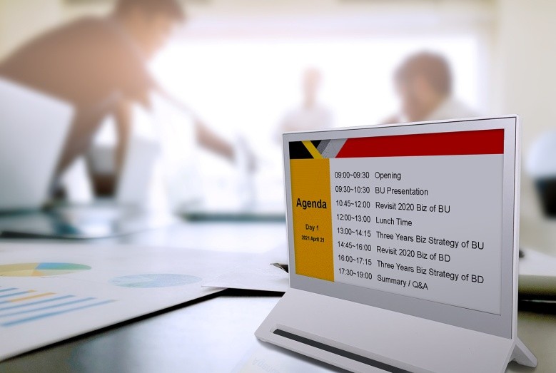Darüber hinaus leuchtet vierfarbiges elektronisches Papier nicht spontan, sondern wird durch eine reflektierende Umgebungslichtquelle angezeigt, wodurch Störungen der Umgebung vermieden werden können. Es eignet sich auch für digitale Anzeigeszenen wie Konferenzraum-Namensschilder, Tischkarten, Aktivitätsagenda-Karten , Werbetafeln für Catering-Tische und Informationsschilder für Bankschalter. Angezeigte Bilder und Texte können durch die mobile APP ersetzt werden, die den Inhalt schnell in Echtzeit aktualisieren und Papierverbrauch und Arbeitskosten sparen kann.