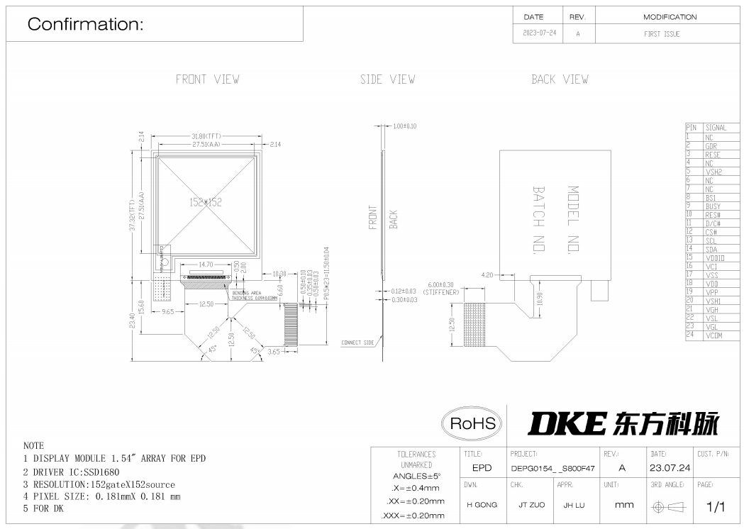 DEPG0154BN ist ein Aktivmatrix-Elektrophorese-Display (AM EPD) mit Schnittstelle und Referenzsystemdesign. Das Display kann Bilder in 1-Bit-Weiß-Schwarz-Vollbilddarstellung darstellen. Die 1,54 Zoll große aktive Fläche umfasst 152 × 152 Pixel. Das Modul ist ein TFT-Array-Elektrophorese-Display mit integrierten Schaltkreisen wie Gate-Treiber, Source-Treiber, MCU-Schnittstelle, Timing-Controller, Oszillator, DC-DC, SRAM, LUT und VCOM. Das Modul kann in tragbaren elektronischen Geräten wie ESL-Systemen (Electronic Shelf Label) eingesetzt werden.