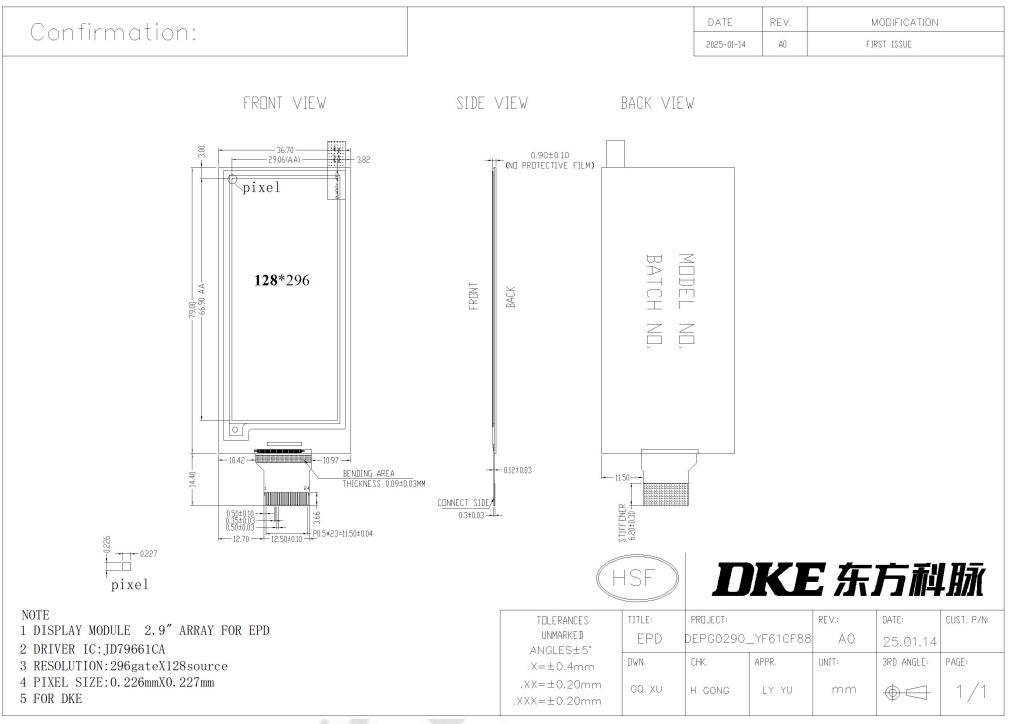 DEPG0290RYF61CF88 ist ein Aktivmatrix-EPD-All-in-One-Treiber mit Timing-Controller für ESL. Die Quellen verfügen über 2-Bit-Ausgänge pro Pixel zur Unterstützung von Weiß/Schwarz/Rot/Gelb. Die 2,9 Zoll große aktive Fläche umfasst 168 × 384 Pixel. Das Modul ist ein TFT-Array-Elektrophorese-Display mit integrierten Schaltkreisen wie Gate-Treiber, Source-Treiber, MCU-Schnittstelle, Timing-Controller, Oszillator, DC-DC, SRAM, LUT und VCOM. Das Modul kann in tragbaren elektronischen Geräten wie ESL-Systemen (Electronic Shelf Label) eingesetzt werden.