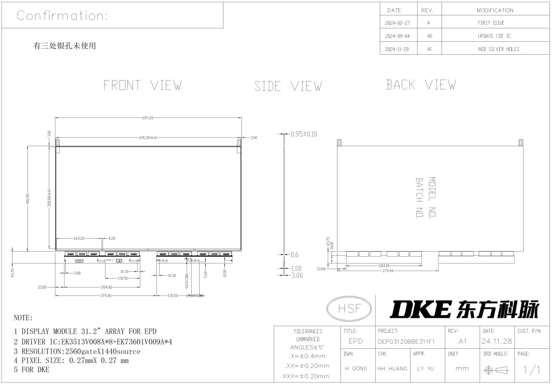 Es verfügt über eine aktive Fläche von 31,2 Zoll mit 2560 x 1440 Pixeln und einem Seitenverhältnis von 16:9. Es handelt sich um ein Anzeigemodul mit reflektierender elektrophoretischer Technologie auf Basis eines TFT-Substrats mit aktiver Matrix. Das Display kann Bilder mit 2 bis 16 Graustufen (1 bis 4 Bit) anzeigen.