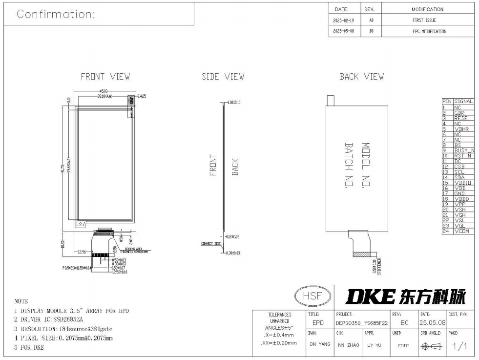DEPG0350RYS685F23 ist ein Aktivmatrix-EPD-All-in-One-Treiber mit Timing-Controller für ESL. Die Quellen verfügen über 2-Bit-Ausgänge pro Pixel zur Unterstützung von Weiß/Schwarz/Rot/Gelb. Die 3,5 Zoll große aktive Fläche umfasst 384 × 184 Pixel. Das Modul ist ein TFT-Array-Elektrophorese-Display mit integrierten Schaltkreisen wie Gate-Treiber, Source-Treiber, MCU-Schnittstelle, Timing-Controller, Oszillator, DC-DC, SRAM, LUT und VCOM. Das Modul kann in tragbaren elektronischen Geräten wie ESL-Systemen (Electronic Shelf Label) eingesetzt werden.
