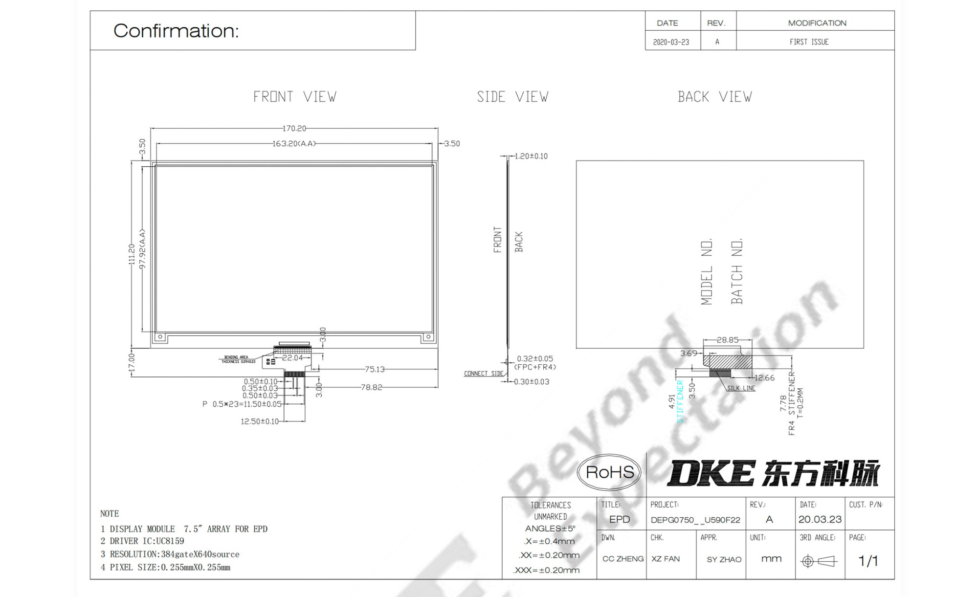 DEPG0750BNU590F45 ist ein Aktivmatrix-Elektrophorese-Display (AM EPD) mit Schnittstelle und Referenzsystemdesign. Das Display kann Bilder in 1-Bit-Weiß, Schwarz und Rot vollflächig darstellen. Die 7,5 Zoll große aktive Fläche umfasst 640 × 384 Pixel. Das Modul ist ein TFT-Array-Elektrophorese-Display mit integrierten Schaltkreisen wie Gate-Treiber, Source-Treiber, MCU-Schnittstelle, Timing-Controller, Oszillator, DC-DC, SRAM, LUT und VCOM. Das Modul kann in tragbaren elektronischen Geräten wie ESL-Systemen (Electronic Shelf Label) eingesetzt werden.