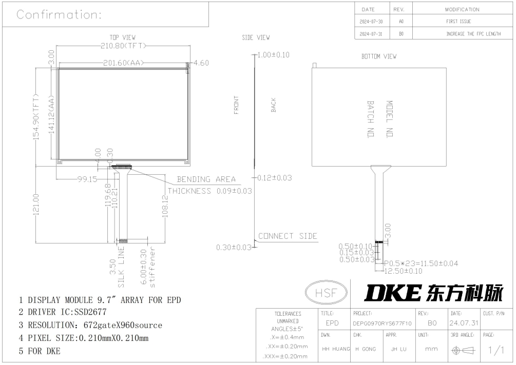 DEPG0970RYS677F6 ist ein Aktivmatrix-EPD-All-in-One-Treiber mit Timing-Controller für ESL. Die Quellen verfügen über 2-Bit-Ausgänge pro Pixel zur Unterstützung von Weiß/Schwarz/Rot/Gelb. Die 9,7 Zoll große aktive Fläche umfasst 960 × 672 Pixel. Das Modul ist ein TFT-Array-Elektrophorese-Display mit integrierten Schaltkreisen wie Gate-Treiber, Source-Treiber, MCU-Schnittstelle, Timing-Controller, Oszillator, DC-DC, SRAM, LUT und VCOM. Das Modul kann in tragbaren elektronischen Geräten wie ESL-Systemen (Electronic Shelf Label) eingesetzt werden.